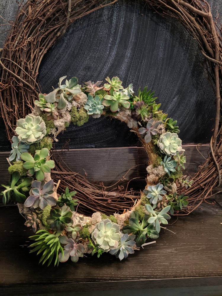 This stunning Wreath has all the feels of Fall and brings warmth and coziness to any room of your home. Welcome Fall into your home or the home of someone special with this fresh succulent wreath. Available now until the end of November.